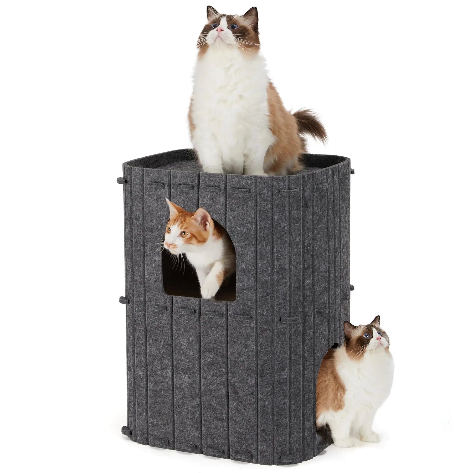 ["All-in-One Cozy Bed: FUKUMARU cat house is a comfy place for our cats to relax to rest to hide and to play in fun. Simply design while diverse uses a combined solution as cat furniture. Featuring different levels for quiet napping and interactive play meeting all the cats different needs in one place. Suitable for all seasons the cat cave keeps your cat cozy in winter and cool in summer providing continuous pleasure throughout the year." "2-Storey Cat House for Multi-Cats: The cat bed for indoor cats with 2-storey design can accommodate at least three cats lying down or resting at once. Total 3 levels with extra large inner space in each level gives each cat their own space so they dont have to fight over territory. The two entrances make it fun for group play and hide-and-seek games encouraging friendly interactions." Warm Felt for Privacy & Embrace: Made from natural felt the cat condos offer a complete sense of security and privacy featuring a cube enclosure that serves as a perfect retreat for cats when they feel scared or under stress. The covered cat bed not only ensures a warm and cozy environment thanks to its insulating properties but also acts as a natural sound buffer provide a tranquil area where cats can feel both safe and at ease. Simple but Stable Design: The indoor cat house is constructed with a straightforward but sturdy structure and each level is capable of supporting cats weighing up to 22 pounds (10 kilograms). Made with premium felt material and undergone rigorous load-bearing test it offers a secure and safe area for your cats where they can leap and play without worry. Easy Assembly & Easy Care: We focus on making life easier for you with quick snap-in and a detachable design this indoor cat cube is easy to assemble and fold flat for convenient storage. The parts are detachable so it is very convenient to clean the fur up by just use a vacuum or a cleaning roller for a quick tidy-up. Maintain a spotless environment for your cat with hardly any hassle.]